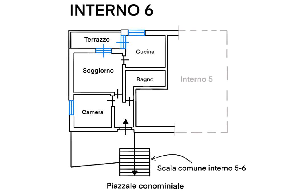 Appartamento composto da ingresso, camera da letto, cucina abitabile, sala, bagno e balcone.