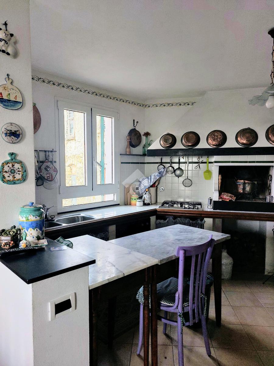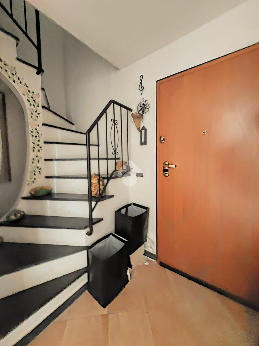 Dall'ingresso principale, al secondo piano, si accede all'ampio salone con camino, alla cucina abitabile, alla sala da pranzo e al primo dei due bagni dell'immobile.